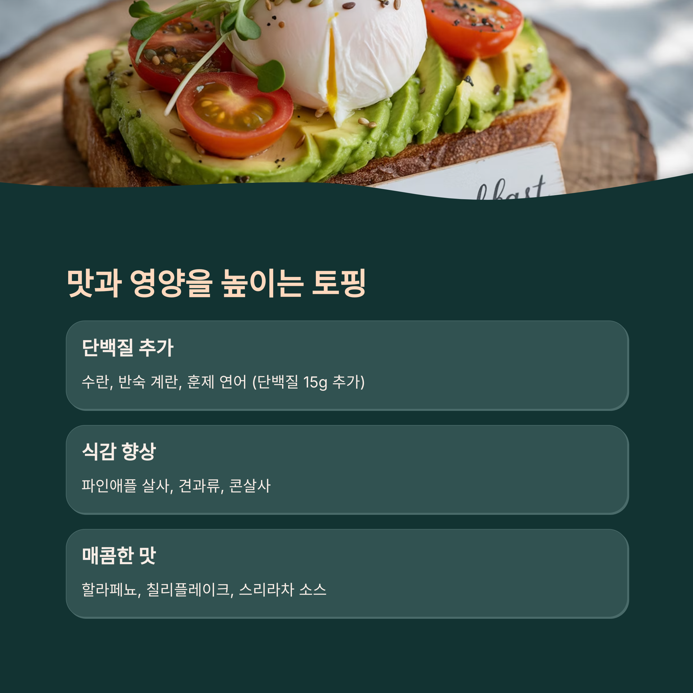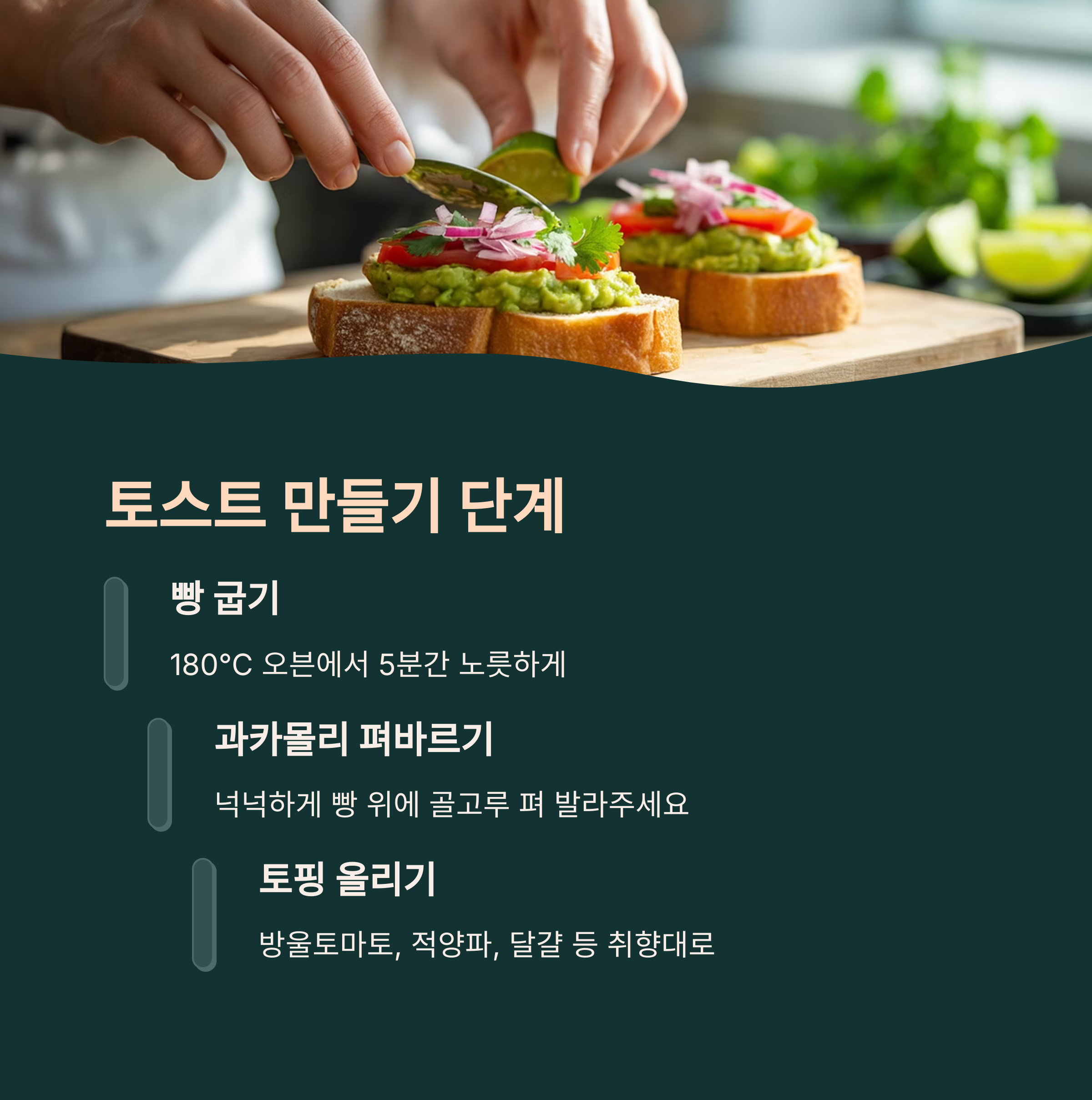 | 4단계 | 바삭한 토스트 위에 얹고 씨앗이나 허브를 곁들인다 |