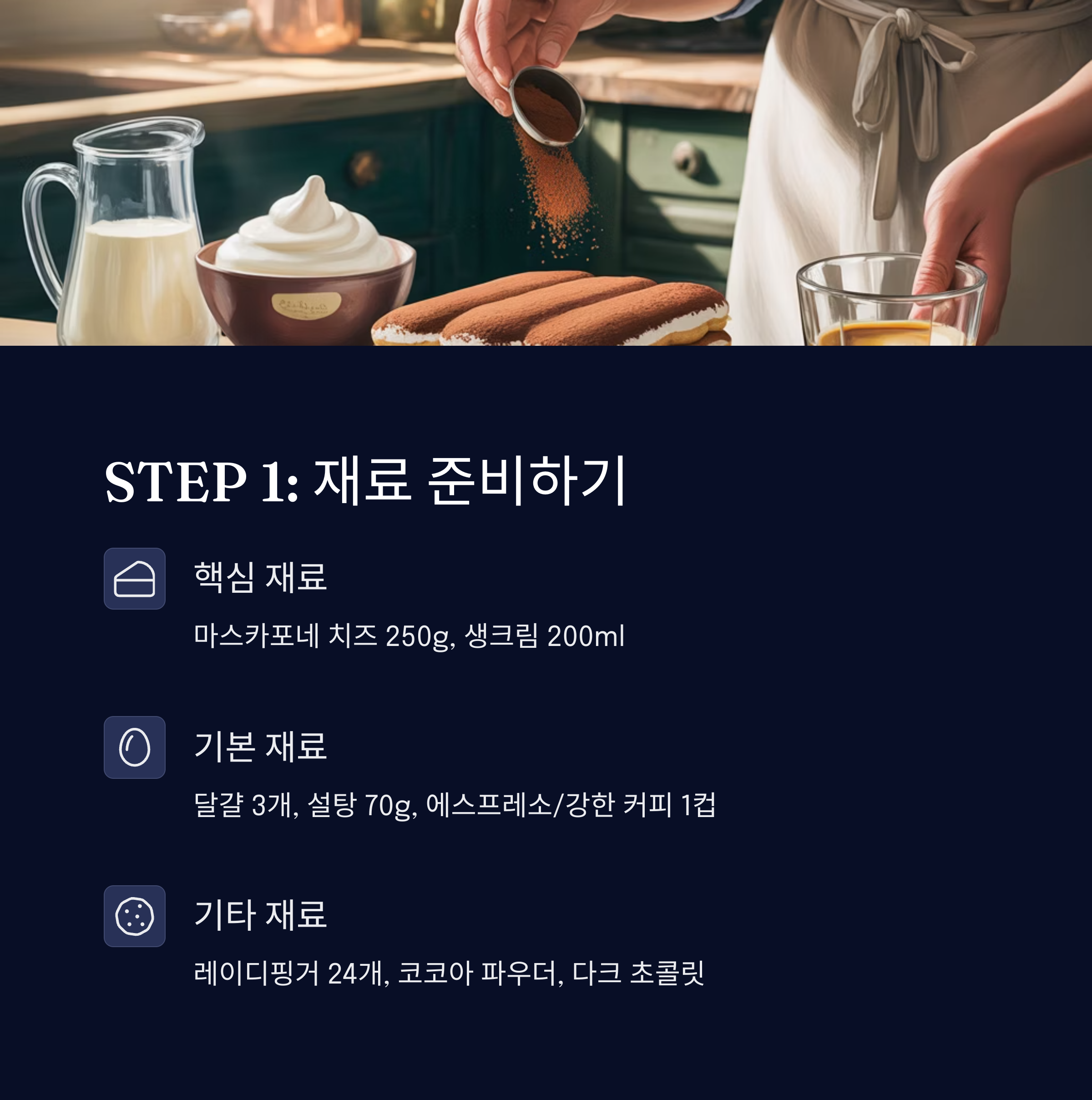| 기본 재료 | 마스카포네 치즈 250g, 생크림 200ml, 설탕 40g, 커피 또는 에스프레소 100ml, 레이디핑거 또는 카스텔라 |