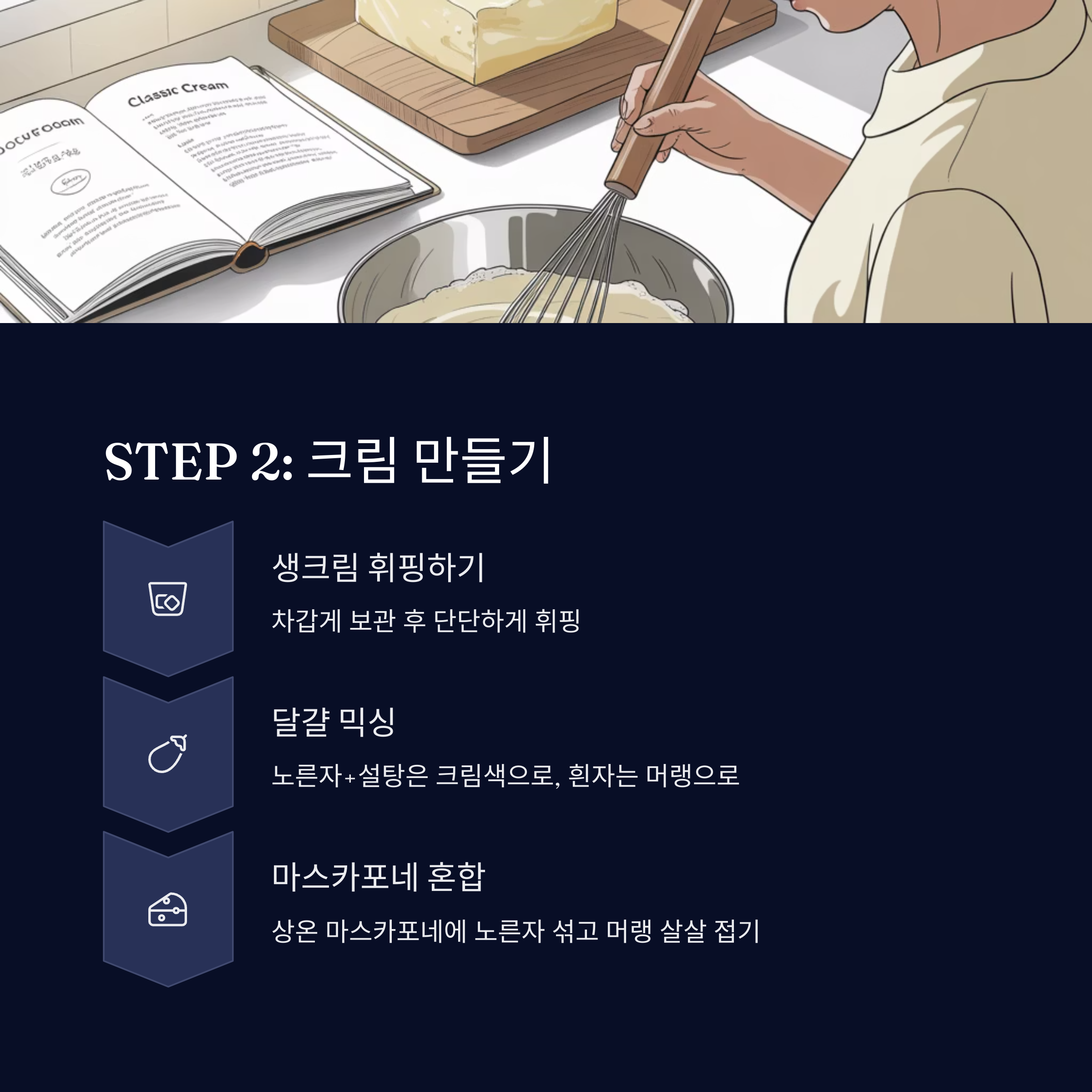 | 1단계 | 생크림을 휘핑하고 마스카포네와 섞어 크림 완성 |
