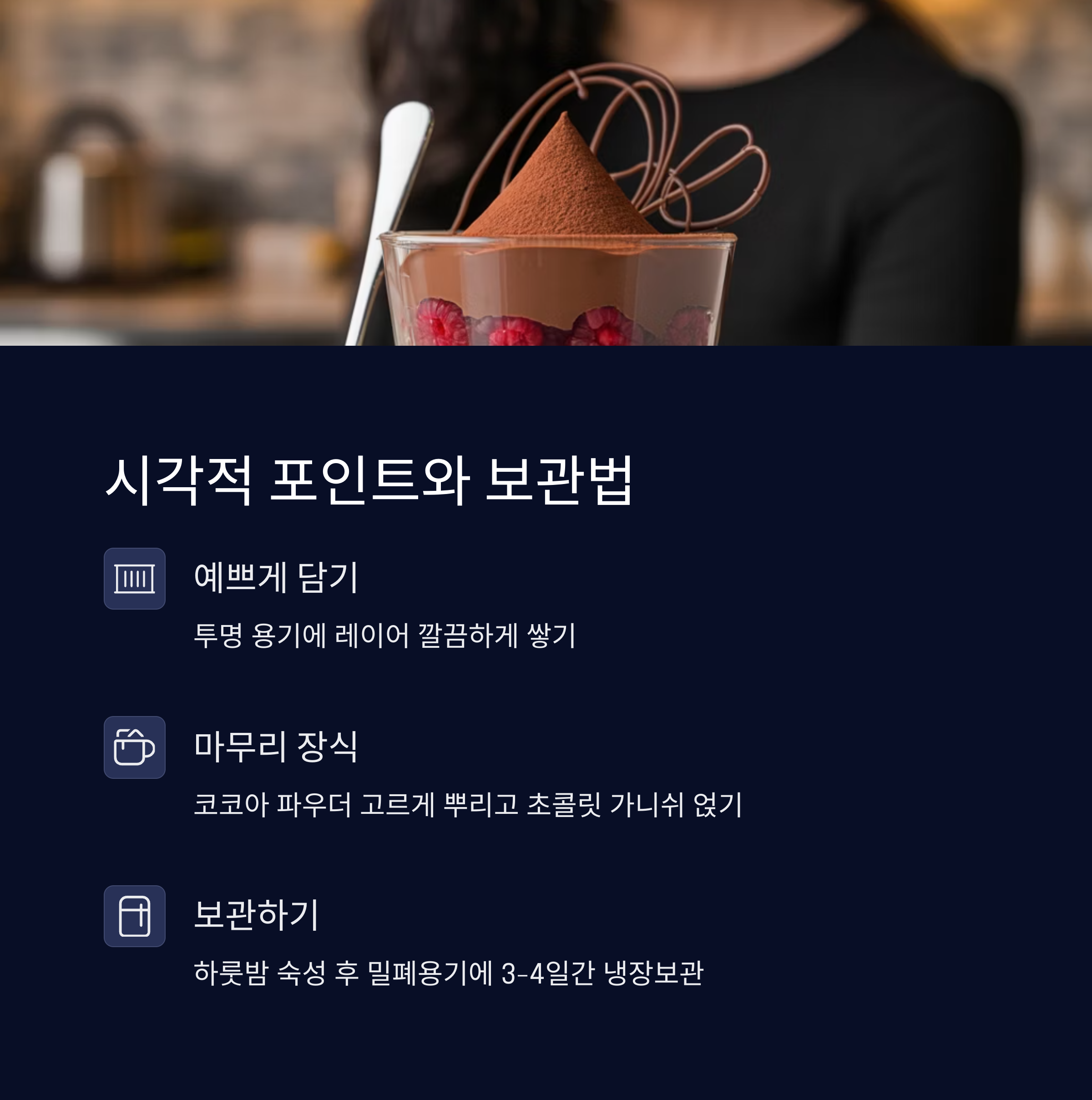 마지막 크림층 위에 체 친 코코아파우더를 듬뿍 뿌리고 민트잎, 다크 초콜릿 조각, 딸기 슬라이스를 올리면 카페 스타일 비주얼을 연출할 수 있습니다. 작은 유리 컵에 층층이 담는 것도 추천합니다.