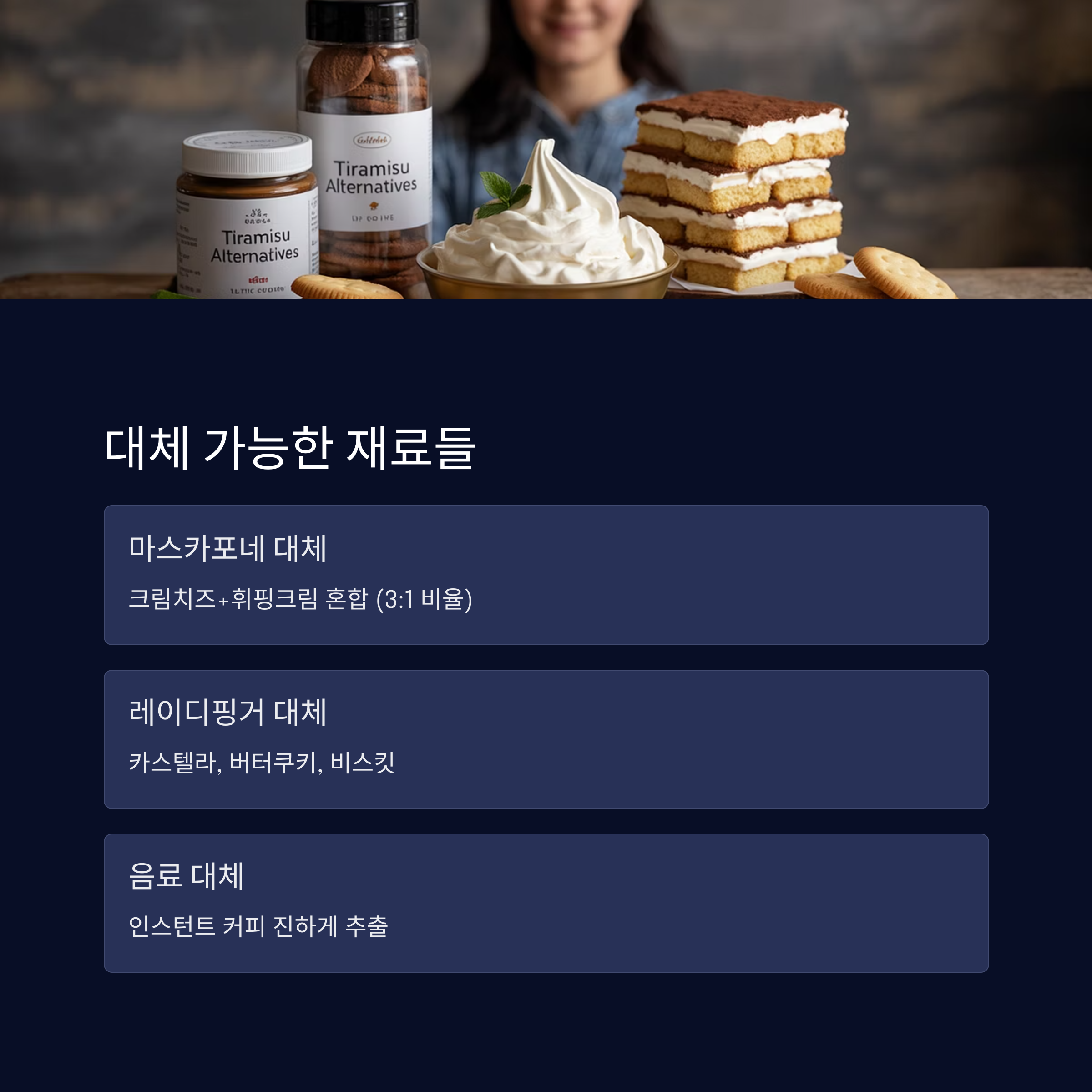 마스카포네는 티라미수의 핵심이지만, 구하기 어렵다면 크림치즈와 생크림을 2:1 비율로 섞은 혼합 크림도 대체 가능합니다. 다만 풍미가 다소 떨어질 수 있으므로 바닐라 익스트랙이나 럼주로 향을 보완하세요.